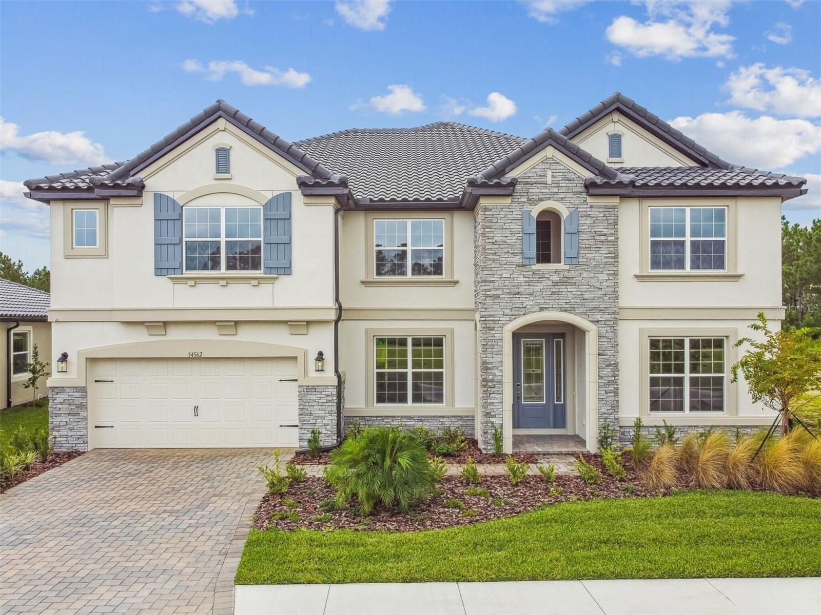 New construction home by M/I Homes in Shortgrass at Two Rivers. Popular Gradsail III floorplan, elevation D. Discover this impressive new construction home built by M/I Homes at 34562 Alger Point in Zephyrhills, Florida. This spacious 5,452 square foot house offers 6 bedrooms and 4 full bathrooms, creating the perfect setting for comfortable family living. This charming home features the following: 6 bedrooms and a den 4 well-appointed full bathrooms strategically placed throughout the home Gourmet kitchen with butler's pantry Game room and media room 3-car garage 47' x 8' lanai and balcony This beautiful new construction home combines comfort and practicality with its spacious design and convenient layout. The open-concept living space creates a welcoming atmosphere that's perfect for both everyday living and special occasions. Your owner's bedroom on the main floor offers privacy and convenience, while the additional bedrooms provide comfortable accommodations for family members or guests. Each bathroom is finished with quality fixtures and materials that reflect the home's overall attention to detail. As a new construction built by respected builder M/I Homes, this home offers the benefit of modern systems, energy efficiency, and the opportunity to be the first family to create memories in this exceptional space. *Photos shown are for representational purposes only and may not depict the actual home.